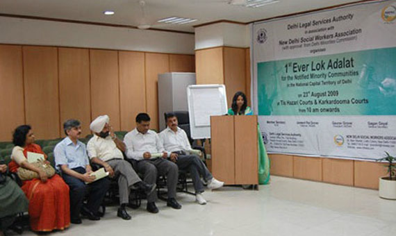 The first ever Lok Adalat for the notified minorities communities in the National Capital Territory of Delhi was organised by New Delhi Social Workers' Association together with Delhi Legal Services Authority on 23rd August 2009. Held at Tis Hazari and Karkardooma Courts simultaneously; 138 cases were taken up and 77 cases were settled involving an amount of Rs 49,22,118 at the Tis Hazari courts; while 67 cases were taken up and 31 were settled at the Karkardooma courts. Notably, a rare achievement in the legal affairs of Indian judiciary.