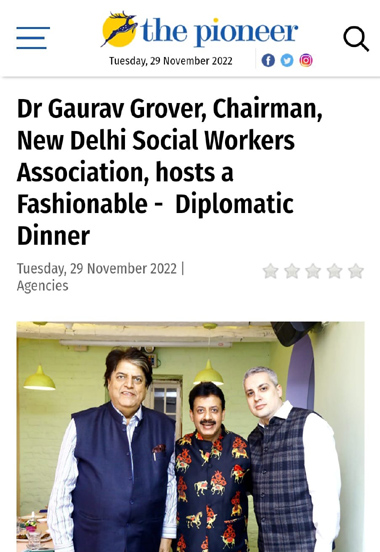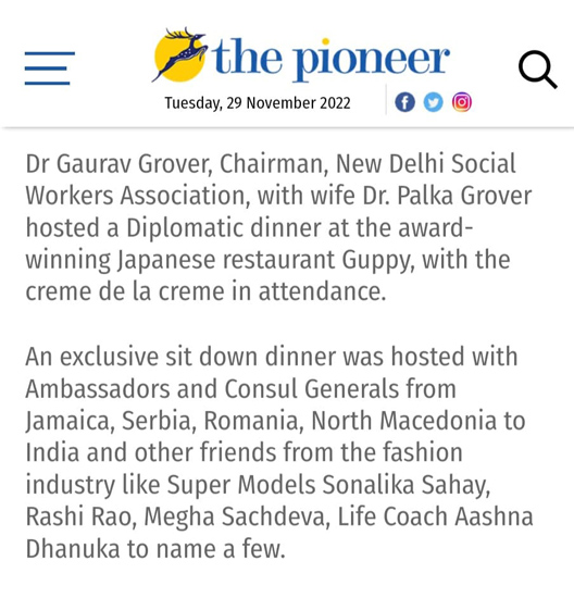 Dr Gaurav Grover, Chairman, New Delhi Social Workers Association, with wife Dr. Palka Grover hosted a Fashionable - Diplomatic dinner at the award-winning Japanese restaurant Guppy.